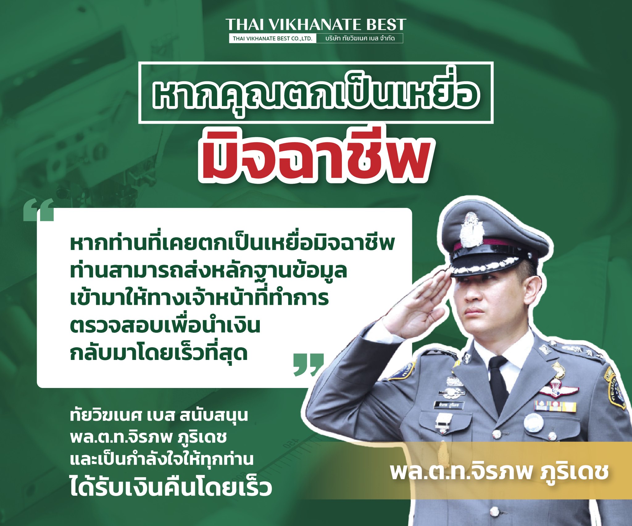 บริษัท ทัยวิฆเนศ เบส ขอประกาศแจ้งเตือน 24 พฤศจิกายน 2025 เราไม่มีส่วนเกี่ยวข้องกับการลงทุนหรือธุรกรรมทางการเงินใดๆ ทั้งสิ้น โปรดระวังมิจฉาชีพที่แอบอ้างชื่อเพื่อหลอกลวงเงิน